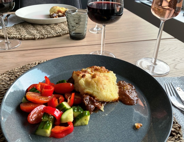 pääruoka cheddarilla täytetty perunamuusikakku lihakastikkeessa