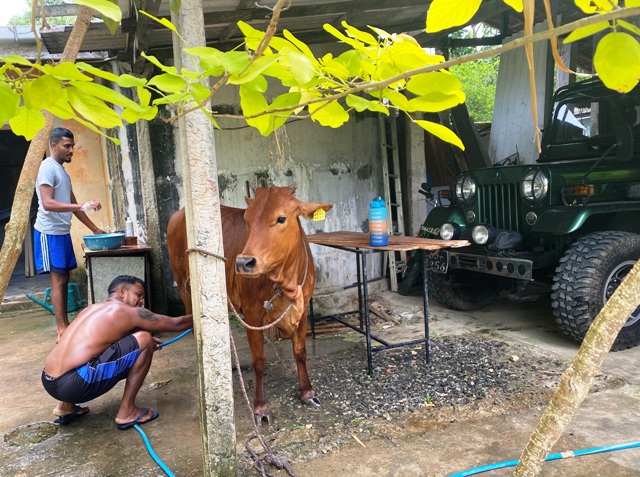 Lehmä nauttii vesipesusta