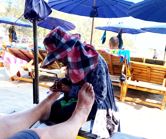 paikat myös meille. Yhteisellä tuk-tukilla palataan iltapäivällä rannalta, kun asutaan heidän kanssaan samassa hotellissa. "OooLaLaa-pedikyristi" on pitänyt
