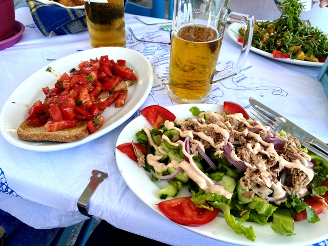 brushetta, tonnikalasalaatti ja rucolasalaatti