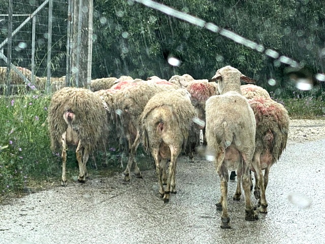 Auton edessä lammaslauma