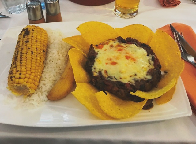 .... chili con carne, paistettu banaani, maissi ja nachot